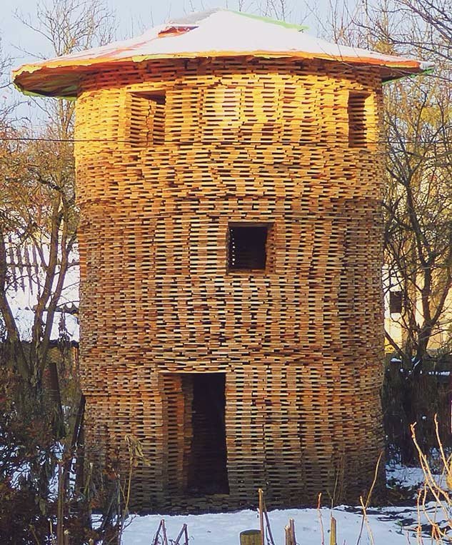 Зроблена вежа із соснових та ялинових обрізків, пішло приблизно три машини дров.