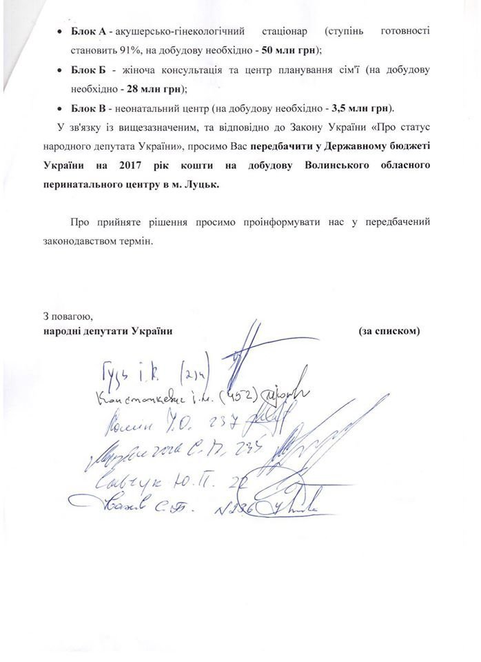«Як і домовилися на останній сесії Волиньради, за пропозицією Ігоря Палиці я ініціював звернення депутатів волинян до Володимира Гройсмана, щодо передбачення в Держбюджеті 2017 року коштів для добудови Волинського обласного перинатального центру. Спробуємо дотиснути це питання!» - прокоментував Ігор Гузь.