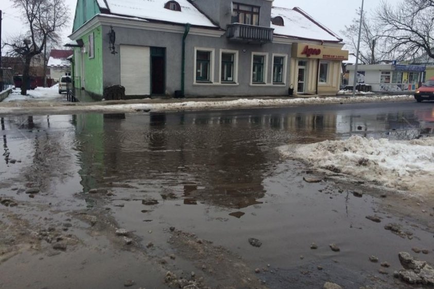 Та вже 8-9 грудня, коли почав розтавати сніг та йти дощ, воді не було куди стікати і вулиця подекуди пішла під воду. Тому в обідню пору працівники «Аміли» за допомогою ломів видовбували зливову каналізацію та лопатами згрібали в неї воду.
