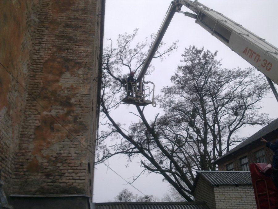 З його допомогою «надзвичайники» підійнялися на висоту третього поверху та за допомогою бензопили порізали похилене дерево. Зрізані частини спустили за допомогою вантажного крана.