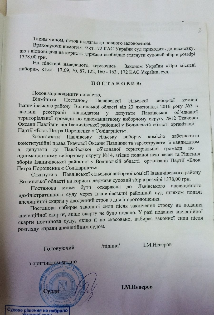 Розглянувши позовну заяву, Іваничівський районний суд постановив позов задовольнити повністю: відмінити Постанову № 3 Павлівської сільської виборчої комісії в частині реєстрації кандидатом у депутати у одномандатному виборчому окрузі № 12 від політичної партії «Блок Петра Порошенка «Солідарність» Оксани Ткачової; зобов’язати Павлівську сільську ТВК зареєструвати Оксану Ткачову кандидатом у депутати в одномандатному виборчому окрузі № 14.