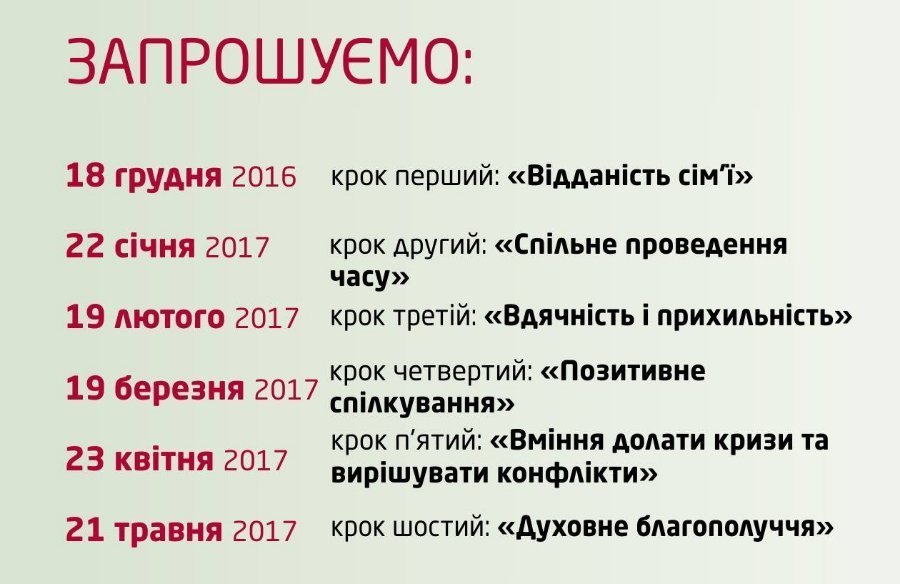 Цей захід для чоловіків, жінок, подружніх пар, які бажають отримати якісні знання та напрацювати навики (спілкування, вирішення конфліктів тощо), а також отримати підтримку.