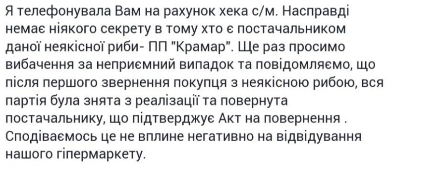 «У понеділок, 12 грудня, мені зателефонувала працівниця відділу зв’язків з громадськістю і розповіла, як вони відреагували на мою заяву. Мовляв зіпсовану рибу повернули постачальнику. На запитання чому не перевірили її якість до того, як виставляти на продаж, відповіла, що це можна дізнатись лише її розморозивши...Щоправда сказати, хто саме постачав такий товар спершу не захотіли», - йдеться у дописі.