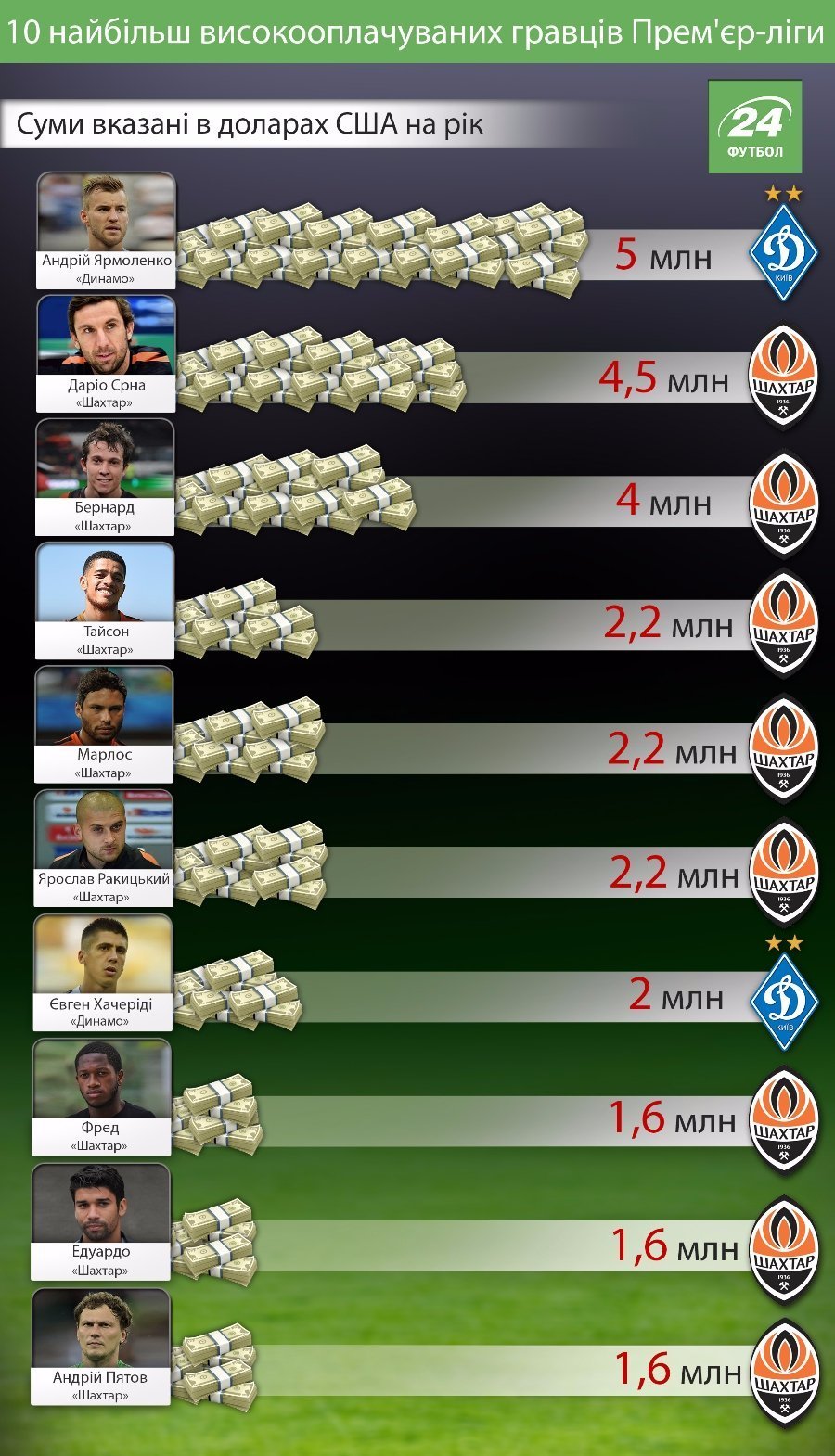 Не дивно, що в рейтингу зарплат знаходяться лише гравці "Шахтаря" та "Динамо", адже інші клуби чемпіонату України сильно "поступаються" в рівні заробітної плати.