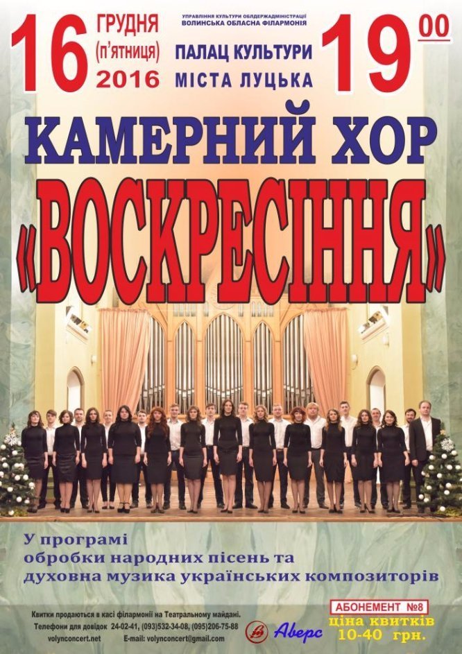 Виступ камерного хору відбудеться у п’ятницю о 19.00 у луцькому палаці культури, ціна квитка від 10 до 40 гривень.