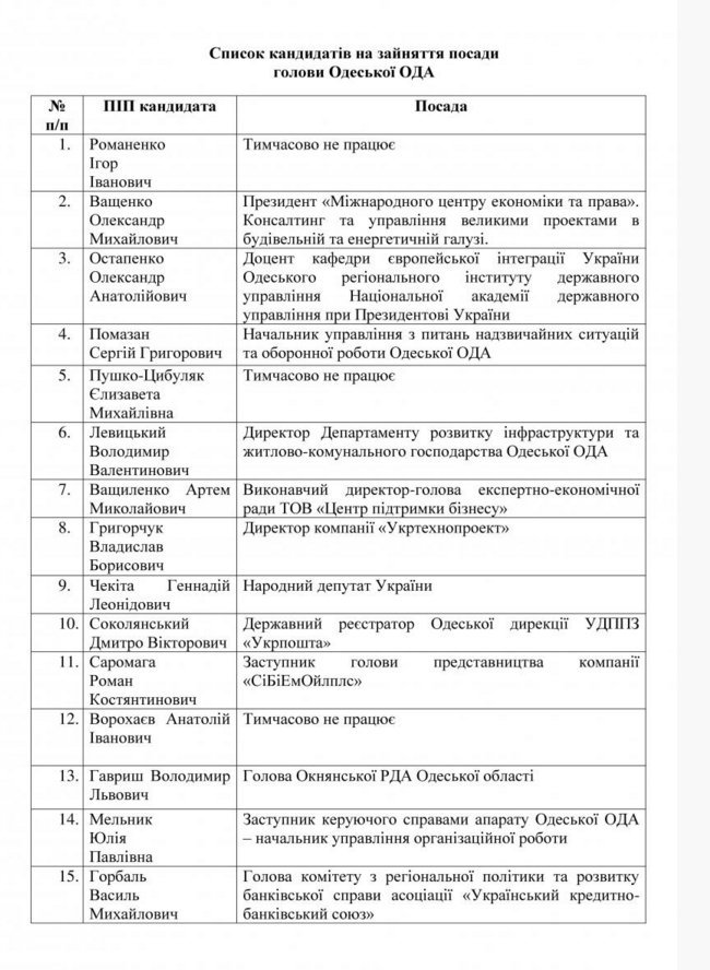 Зазначимо, Президент України Петро Порошенко оголосив конкурс на посаду глави Одеської ОДА. До його призначення, Одеська область буде знаходитися під особистим контролем Прем'єр-міністіра Володимира Гройсмана.