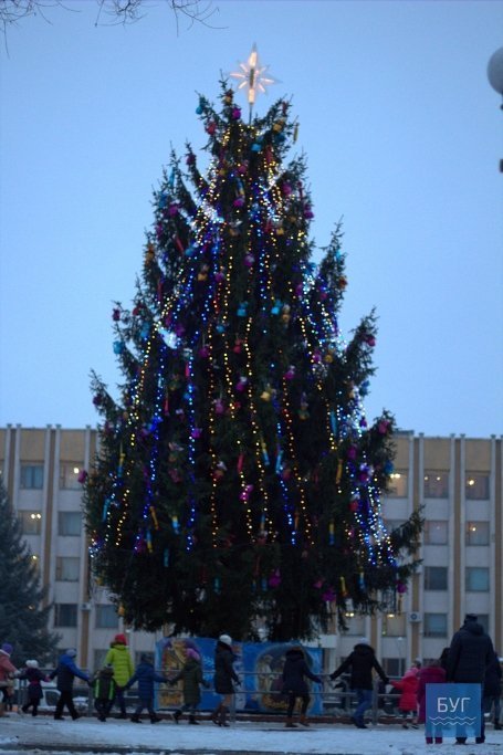 Малеча, яка зібралась навколо новорічного дерева, рахувала до трьох, перш ніж ялинка засяяла. ЇЇ прикрасили стилізовані прикраси та ілюмінація.