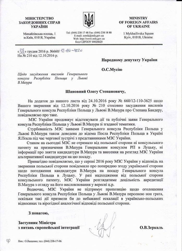 Міністерство закордонних справ України відповило офіційним листом нардепу Олегу Мусію стосовно засудження Генерального консула Республіки Польща у Львові Вєслава Мазура про Степана Бандеру.