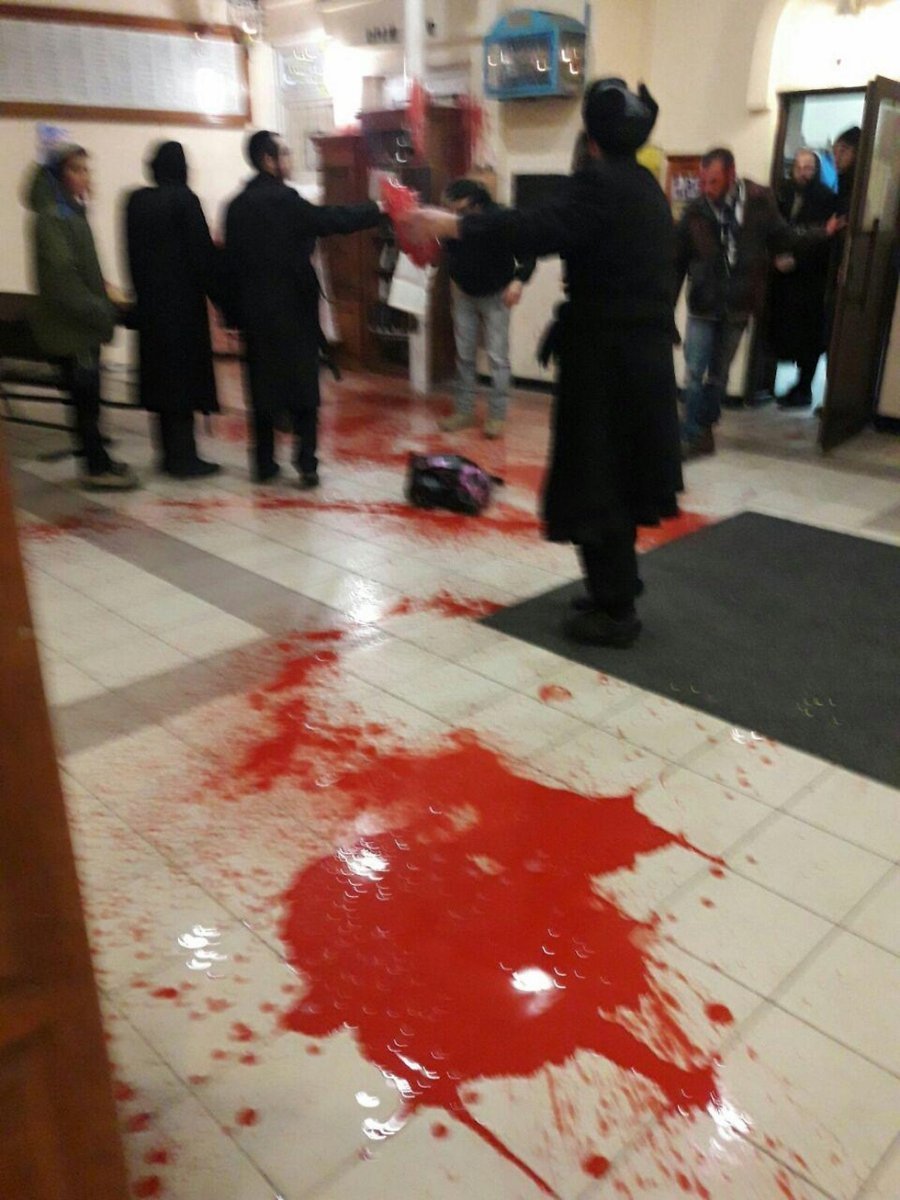 "Кілька євреїв, що знаходилися в будівлі, зуміли втекти звідти і викликати поліцію. Погромники ж залили все приміщення червоною фарбою, що, мабуть, символізує кров", - зазначає IzRus.