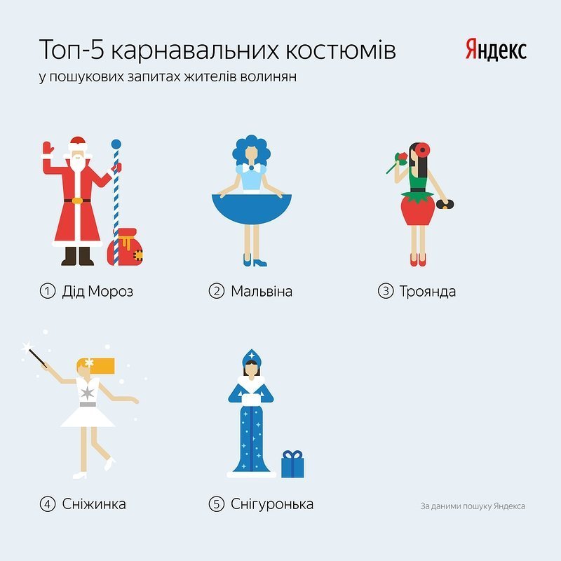 П’ятірку найпопулярніших карнавальних костюмів за запитами волинян у пошуковій системі «Яндекс» очолило вбрання Діда Мороза.