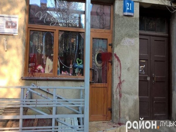 Невідомі облили червоною фарбою крамничку «Павутинка» на вулиці Кривий Вал у Луцьку.
