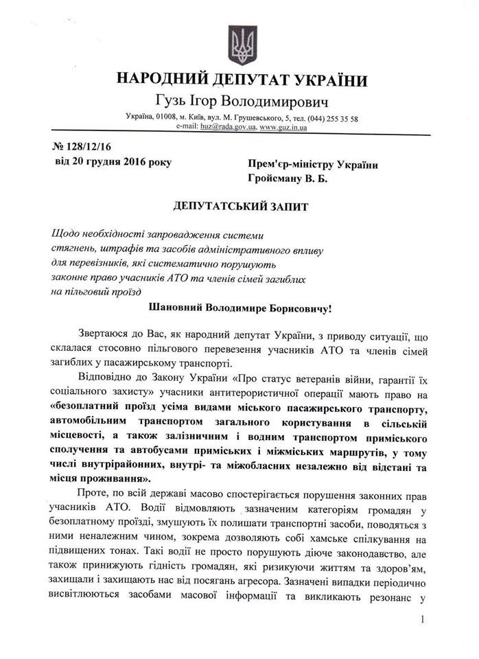 Народний депутат України Ігор Гузь звернувся із запитом до Прем’єр-міністра врегулювати ситуацію у громадському транспорті щодо учасників АТО.
