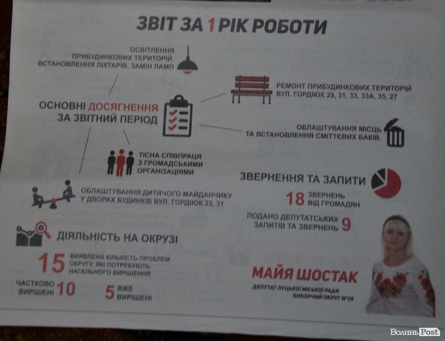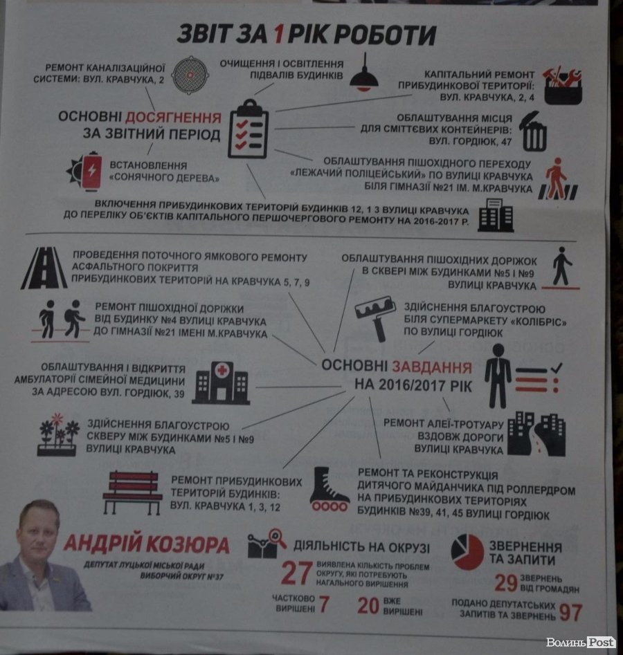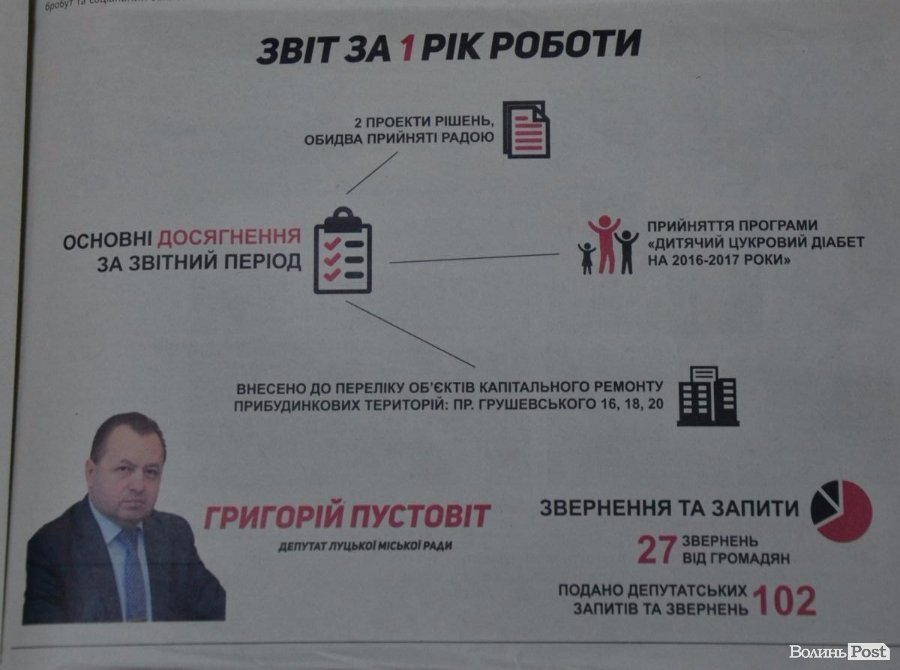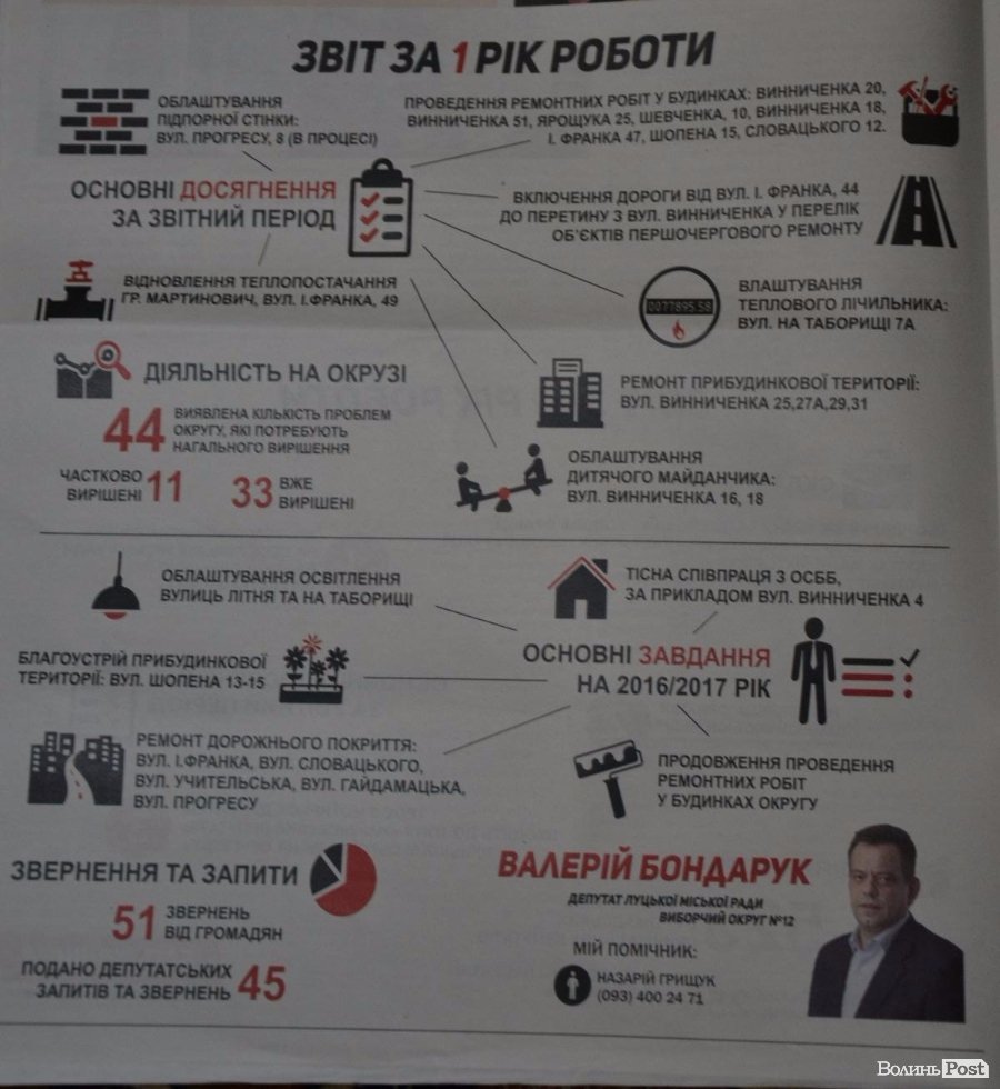 За словами лідера Луцької міської партійної організації та фракції у міськраді Валерія Бондарука, за рік вони стали найефективнішою фракцією ради, адже лише 4 депутати змогли подати 18 проектів рішень, тобто 26% він усіх прийнятих на сесії міської ради проектів депутатів. Також напрацювали 256 депутатських звернень і запитів із 1024. У цьому напрямку Бондарук відзначає найактивнішого депутата фракції Григорія Пустовіта.