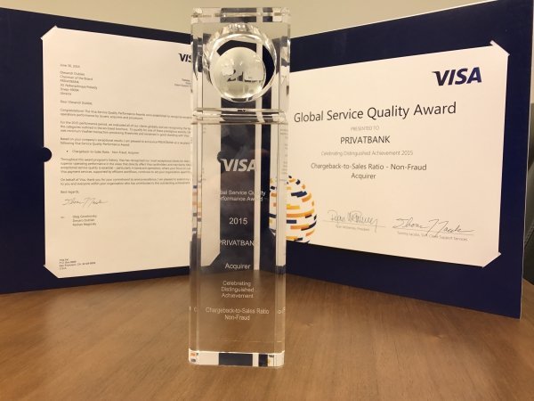 Міжнародна платіжна система Visa визнала український ПриватБанк одним з кращих в світі банків за якістю обслуговування банківських карток. В рамках глобальної програми Visa Global Service Quality Performance Awards, ПриватБанк відзначений нагородою в номінації Chargeback–to Sales Ratio-Non-Fraud Chargeback, Acquirer (найменьша частка спірних і шахрайських транзакцій в торговому обороті еквайєра).