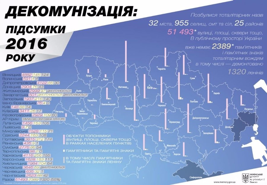Однак фахівці наголошують, що цей процес ще не завершений. За 2016 рік люди обрали нові назви для 51 493 вулиць та 987 міст і сіл в Україні. Про це повідомили в Інституті національної пам'яті, - пише ТСН.