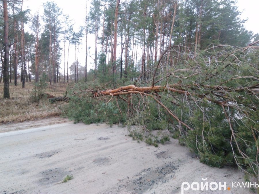 Унаслідок сильних поривів вітру при в'їзді у село Черче Камінь-Каширського району на дорогу звалилося дерево та заблокувало рух транспорту.