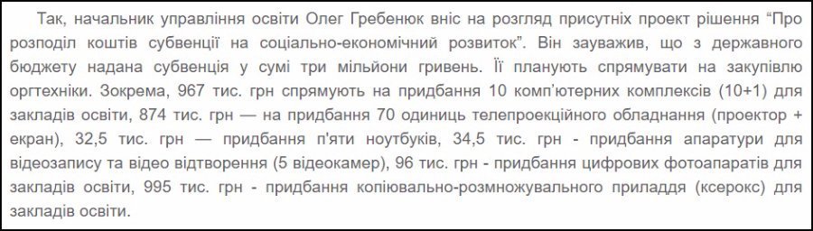 «...вони так спеціально розділили, щоб допорогові закупівлі були і відповідно швидко проводять закупівлю. Але чому не вивчили інший ринок? Я розумію, що субвенцію треба використати. Тут виникає кілька питань – чому саме це купляють, чи це така нагальна потреба і чи вивчався інший ринок?» – розповів голова бюджетної комісії Павло Данильчук.