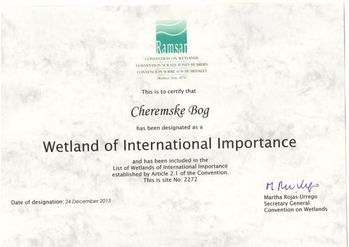 Секретаріат Рамсарської конвенції надіслав лист на адресу Черемського природного заповідника, у якому повідомлялося про надання водно-болотним угіддям заповідника статусу міжнародного значення, а також присвоєння Черемському болоту порядкового номеру 2272.