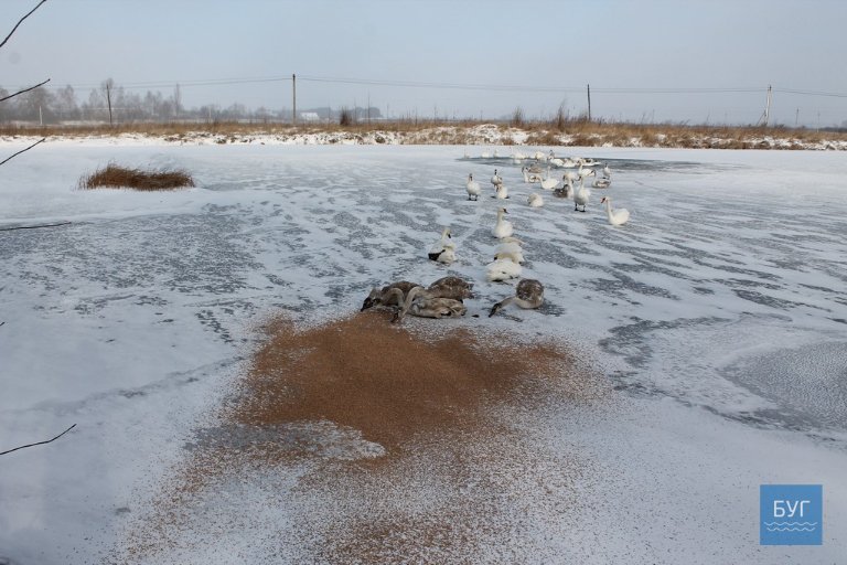 Але до лебедів не так просто наблизитися, крига ненадійна. Довелося висипати зерно на лід.