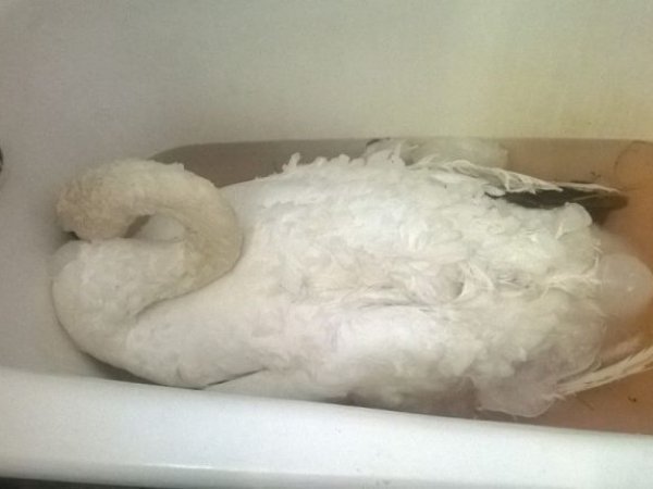 Люди, які його підібрали, повідомляють, що також на білих красенів чатують собаки, а лебідь, який обмерз потребує допомоги ветеринара.