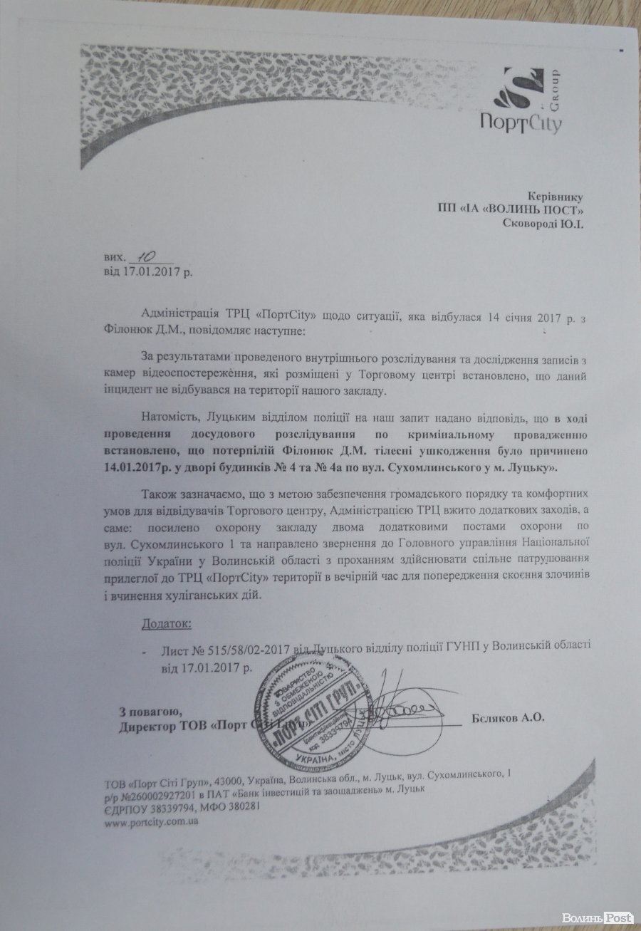 У своєму листі адміністрація закладу пояснила, що після інциденту вжила додаткові заходи безпеки – в торговому центрі встановили додаткові пости охорони та звернулась до ГУНП з проханням здійснювати спільне патрулювання прилеглої до торгового центру території у вечірній час.
