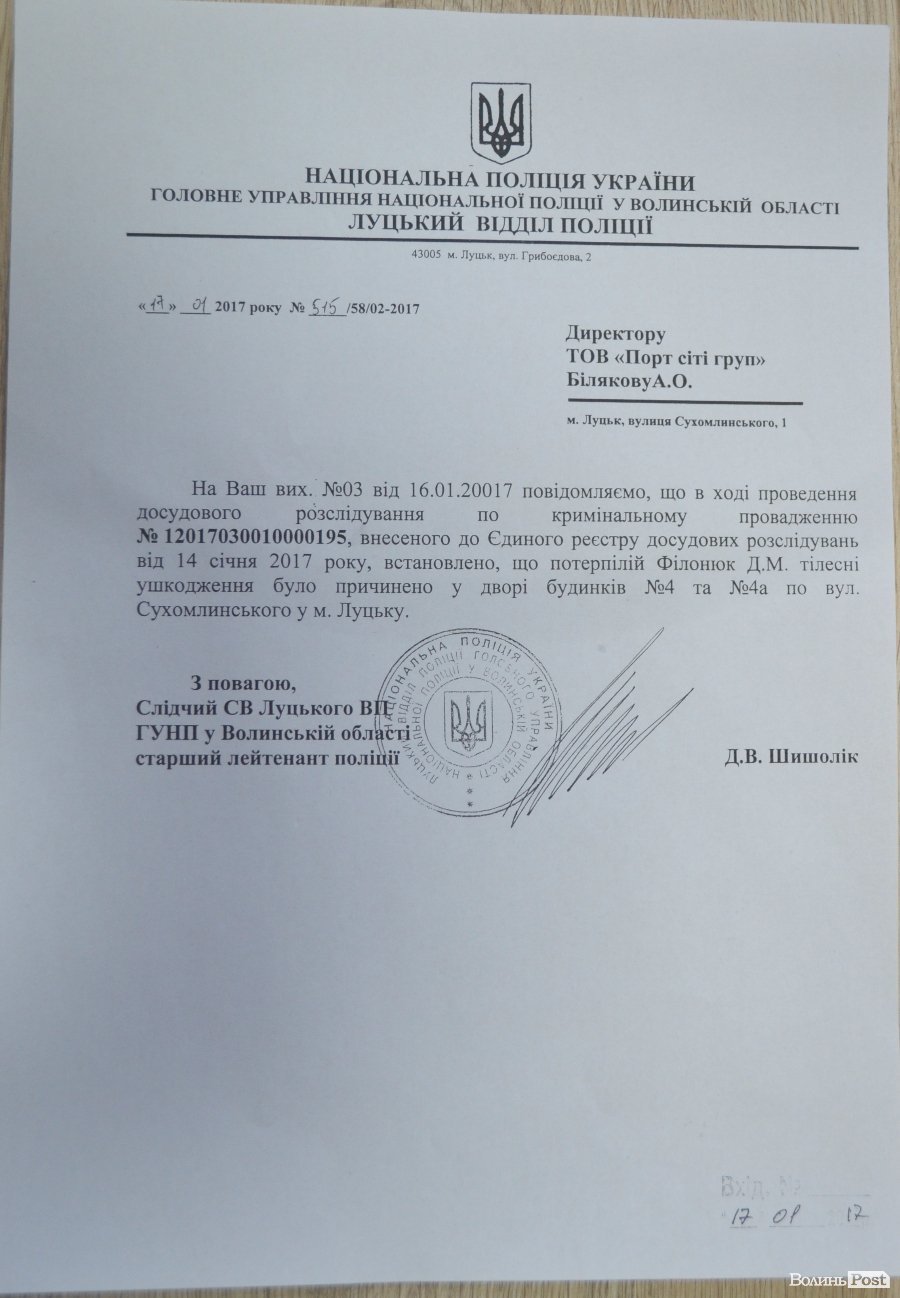 Зокрема в офіційному листі з Луцького відділу поліції вказано, що під час проведення слідчих дій в рамках кримінального провадження, яке внесено до ЄРДР від 14 січня, встановлено, що постраждалій тілесні ушкодження було нанесено саме в дворі будинків.