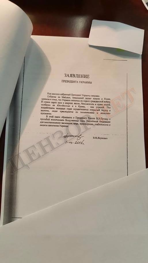 «...Звертаюся до Президента Росії В.В.Путіна з проханням застосувати Збройні сили Російської Федерації для відновлення законності, миру, правопорядку, стабільності й захисту населення України», - зокрема, під такими словами стоїть підпис Януковича.