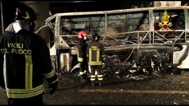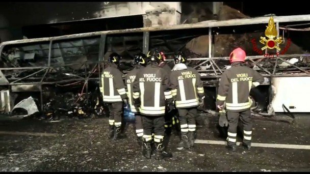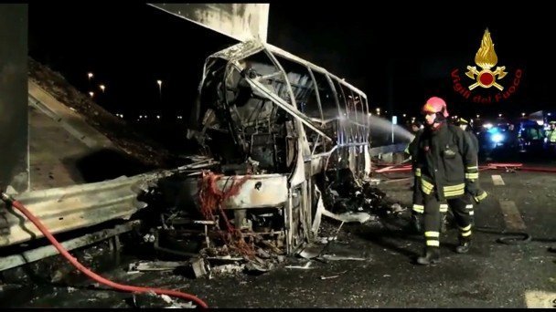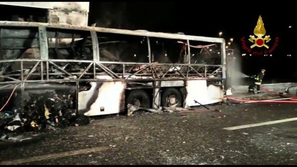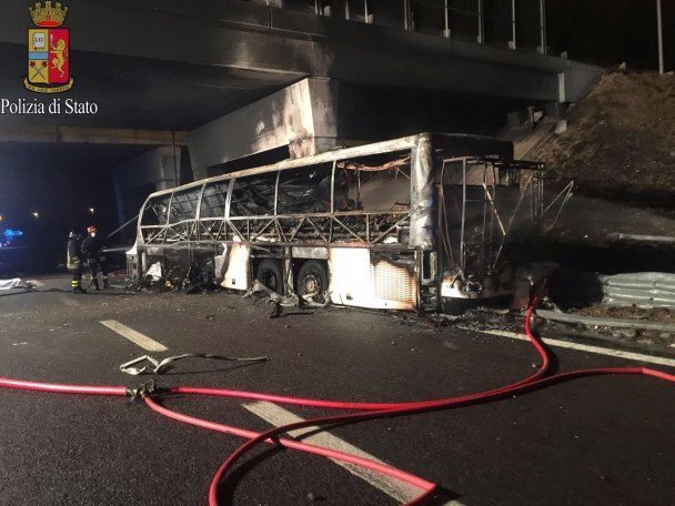 Однак, за даними італійської поліції, автобус врізався в стоп, після чого спалахнув. Серед загиблих – в основному угорські діти.