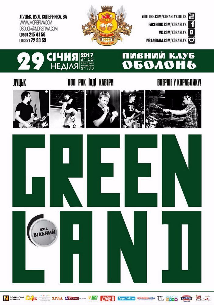 Гурт "Green Land" створений на базі "колишніх" учнів GARAGE Rock School. Прості люди , які люблять музику. Саме нею вони і хотіли б поділитися з усіма, хто завітає у Кораблик цієї неділі. До речі, в "Оболоні" вони гратимуть вперше. Пісні відомих гуртів та виконавців, під які можна підтанцьовувати, підспівувати та просто послухати. Музика без кордонів.