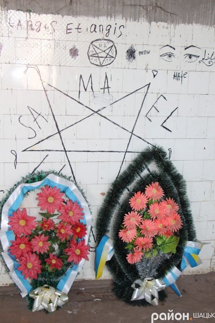 Саме на стінах одного з них були викарбувані дивні тексти, зокрема пісень російського гурту «Найти выход», написи «Бога нет» і символічні малюнки: перевернута пентаграма (п'ятикутна зірка) - символ диявола, свастика. На підлозі - два похоронні вінки.