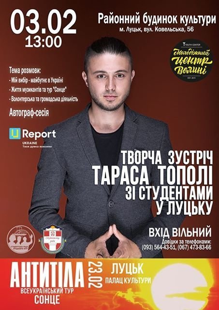 У Луцьку відбудеться творча зустріч лідера гурту Антитіла Тараса Тополі зі студентами та шанувальниками.