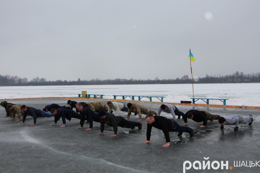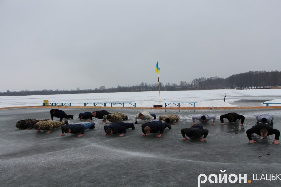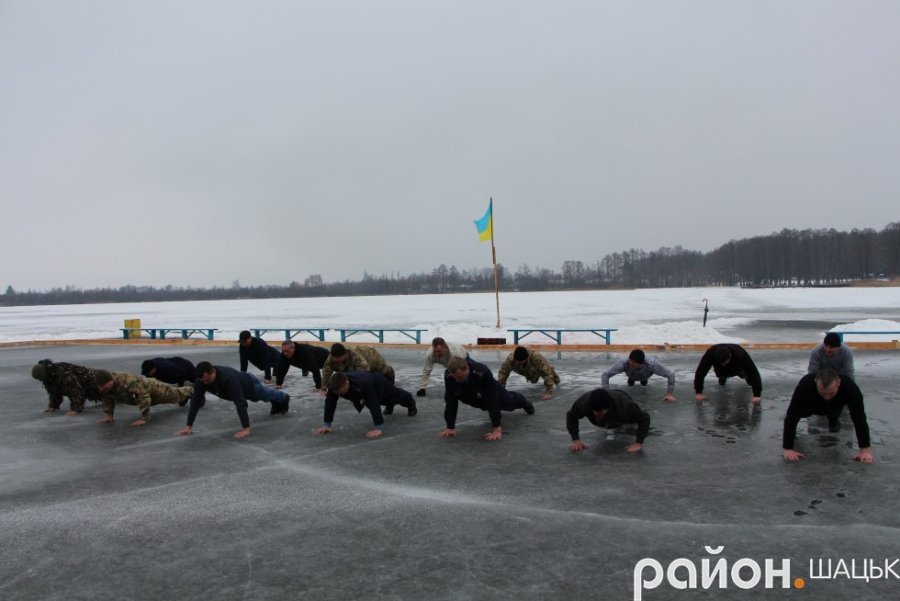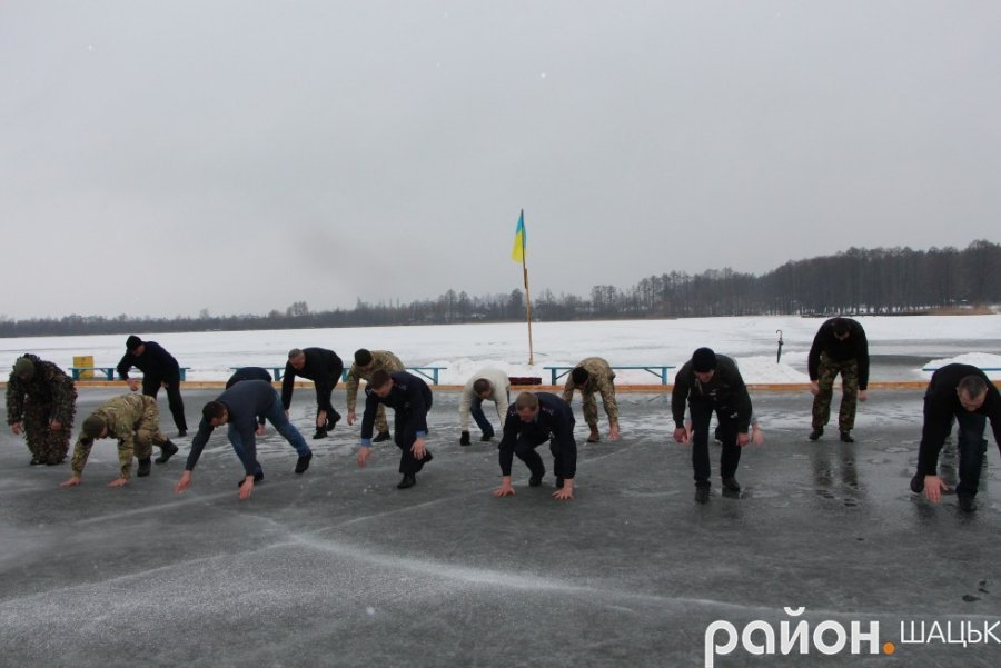 Шацькі воїни АТОзібралися на вкритому кригою озері Велике Чорне, аби 22 рази віджатися в упорі лежачи. Вони прийняли естафету від бійців Любомльського району.