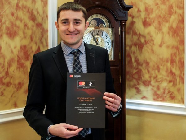 ПриватБанк привітав Євгена Рудченка, переможця акції Mаstеrcard для власників преміальних карток, й урочисто вручив сертифікат для двох осіб на відвідання Берлінського міжнародного кінофестивалю.