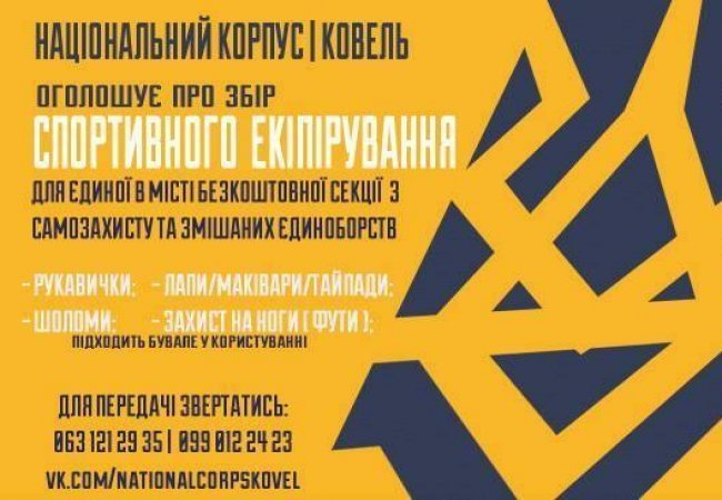 «Національний Корпус Ковель уже протягом чотирьох місяців проводить безкоштовні тренування з основ єдиноборств та самозахисту. Кожне тренування стабільно відвідує близько п'ятдесяти ковельчан різного віку,статі та соціального становища. Хлопці та дівчата віком від 8 до 20 років відвідують наші тренування,тому що ми прикладаємо усі зусилля для того, щоб спорт був доступний кожному», – йдеться в дописі.