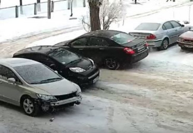 Згідно із записами на камерах спостереження, водій залишив свою машину на в'їзді у двір. Протягом години автомобілі, що заїжджали на парковку, не могли впоратися із керуванням на слизькій дорозі, тож врізалися у легковик, – пише ТСН.