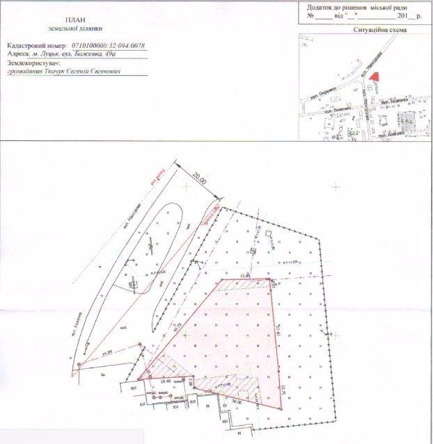 Депутат Луцькради Євгеній Ткачук просить затвердити проект землеустрою щодо відведення земельної ділянки (зміна цільового призначення) на вулиці Боженка, 49 а площею 0,1239 га, кадастровим номером 0710100000:32:094:0078 для будівництва та обслуговування СТО, мийки, магазину та кафе.