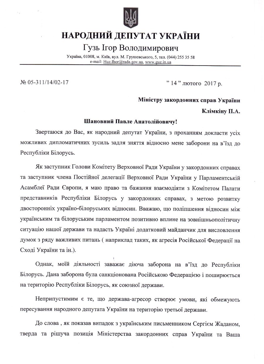 Нагадаємо: 25 квітня 2016 року Ігоря Гузя не пропустили через білоруський кордон: провели обшук автомобіля, та поставили у паспорт відмітку «в'їзд заборонено». За інформацією Посольства України в Республіці Білорусь, Ігор Гузь внесений міграційною службою РБ у список осіб, в’їзд яких на територію цієї країни є небажаними або забороненим до 1 вересня 2020 року, з ініціативи компетентних органів РФ відповідно до угоди із РБ. На думку депутата, це є неприпустимим фактом, що держава-агресор створює умови, що обмежують пересування народних депутатів України на територію Білорусі.