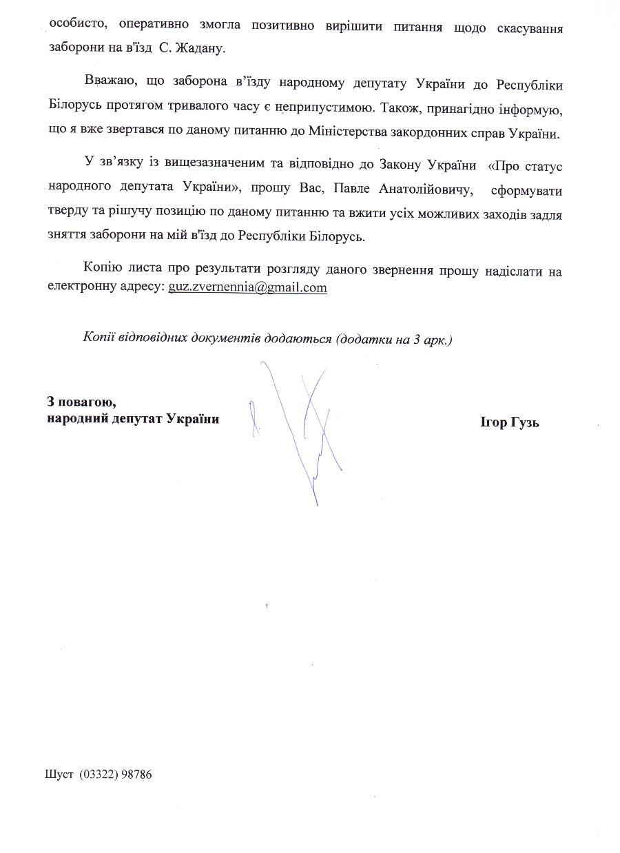 Також він відзначив той факт, що завдяки оперативній реакції МЗС українському письменнику Сергію Жадану нещодавно скасували таку ж заборону на перетин кордону. Тому Ігор Гузь закликав профільного міністра Павла Клімкіна сформувати рішучу позицію та віднайти механізм скасування заборони на в’їзд до Білорусі народним депутатам України.