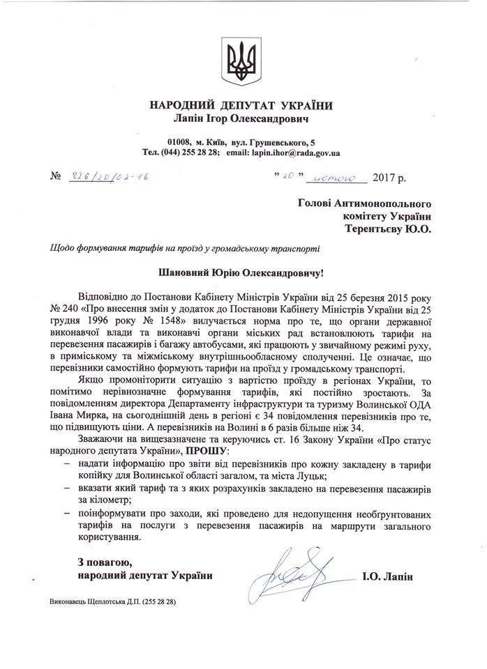 Народний депутат від Луцька Ігор Лапін просить Антимонопольний комітет втрутитися у ситуацію із підвищенням вартості проїзду волинськими перевізниками.