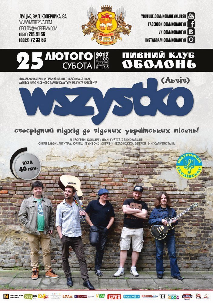 Яскравий і драйвовий гурт Wszystko, чи не єдиний у Львові кавер-бенд, який займається пропагандою саме української музики. Окрім насолоди від голосу і таланту учасників гурту, ви відчуєте себе ніби на концерті улюбленої зірки, завдяки широкому репертуару, в якому можна почути пісні від Білоножко, Миколайчука і Зіброва до Бумбоксу, Другої ріки та Океану Ельзи.