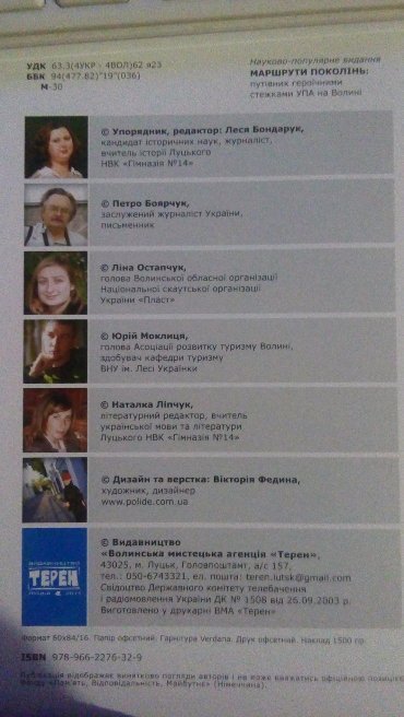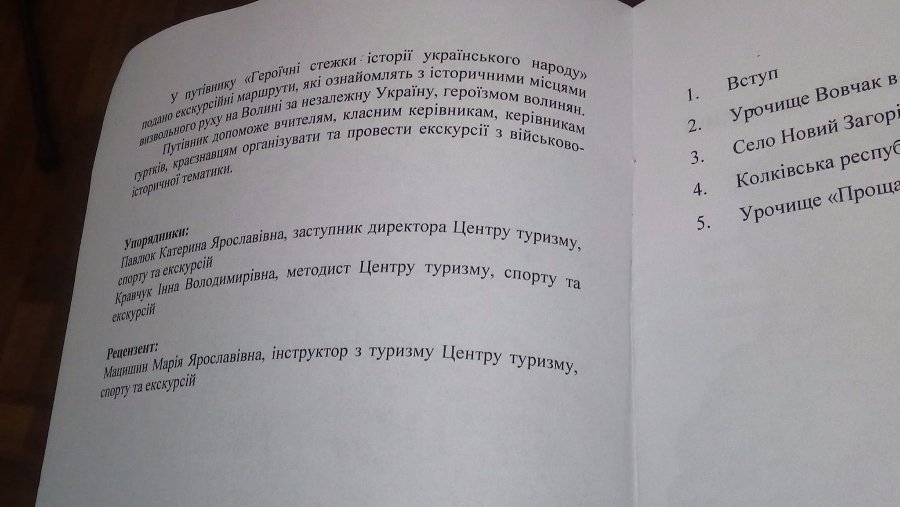 У цій брошурі під назвою «Героїчні стежки українського народу» (Луцьк, 2016), тексти про Вовчак, Новий Загорів та Колківську республіку просто переписано з путівника «Маршрути поколінь: героїчними стежками УПА на Волині». Там немає жодних посилань на авторський колектив нашого путівника. Автором тексту про Новий Загорів є відомий письменник Петро Боярчук, я ж писала розділ про Вовчак і Колківську республіку. Натомість у брошурі Центру туризму вказано, що упорядниками є Павлюк Катерина Ярославівна, заступник директора Центру туризму спорту та екскурсій, а також Кравчук Інна Володимирівна, методист Центру туризму спорту та екскурсій, а рецензентом була Мацишин Марія Ярославівна, інструктор із туризму, спорту та екскурсій. Аж троє людей потрібно було залучити для цього плагіату!!!