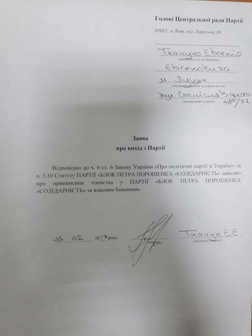 «Повідомляємо про те, що 10 лютого 2017 року у партію надійшла заява за підписом Євгена Ткачука про те, що він виходить з партії. Відповідно, згідно законодавства саме з цього дня він припиняє своє членство у Блоці Петра Порошенка «Солідарність». Додамо, що Євген Ткачук передав заяву при ЗМІ та підтвердив вихід з політичної сили. Отож з 10 лютого 2017 року він не є членом партії», – переконують в патрії.