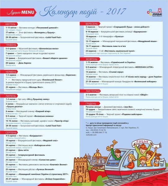 Виконувачка обов’язків начальника управління туризму та промоції міста Луцької міськради Катерина Теліпська розповіла про мистецькі заходи, що відбудуться у Луцьку протягом 2017 року. Чиновники розробили Календар туристичних цікавинок Луцька.