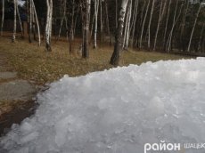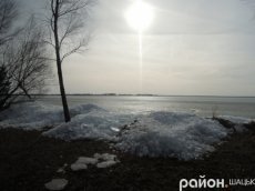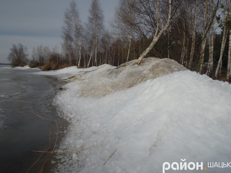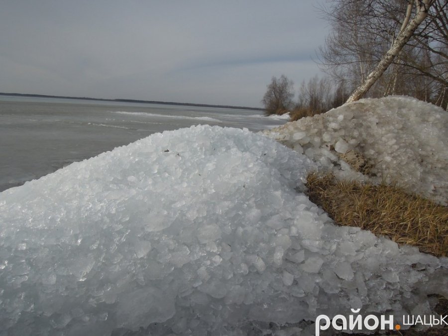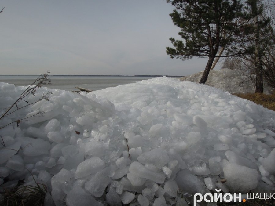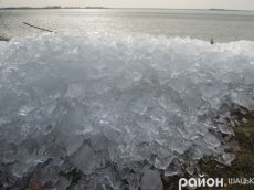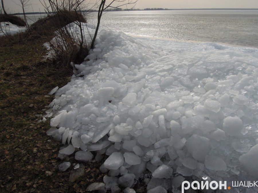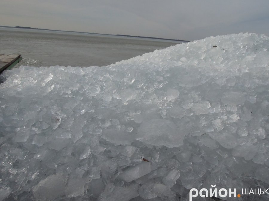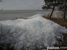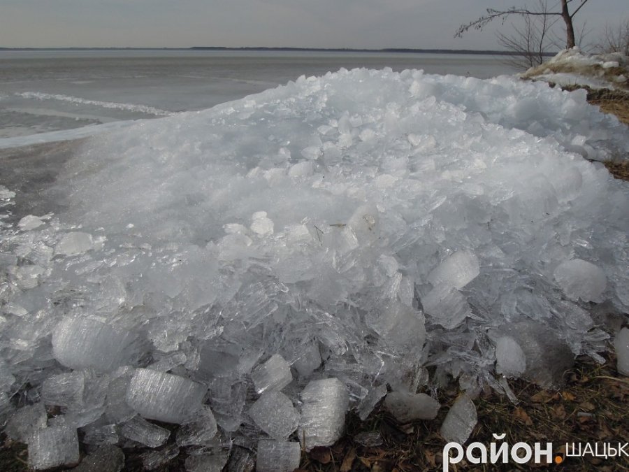 Сильний вітер поламав на водоймі кригу і потужним поривом викинув її на берег. Утворилися цілі гори льоду, схожого на кристали. Під діями сонячних променів вони виглядають просто фантастично.