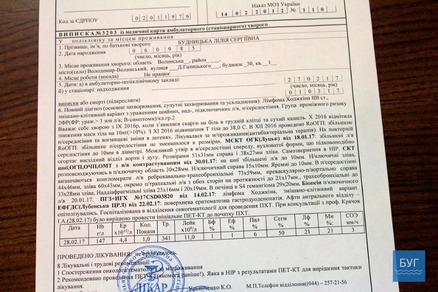 У січні лікарі озвучили жінці діагноз: середостіння лімфома Ходжкіна. Лілія Будницька на обстеження та діагностику вже витратила близько 20 тисяч гривень. А зараз розпочинається дорогий курс лікування.