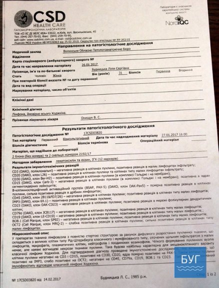 В січні 2017-го року жінці озвучили діагноз - середостіння лімфома Ходжкіна. На обстеження та діагностику Будницька витратила близько 20 тисяч гривень. Наразі розпочинається дороговартісний курс лікування. Він складатиметься із 6-8 хіміотерапій, вартість кожної з яких – 11 тисяч гривень.