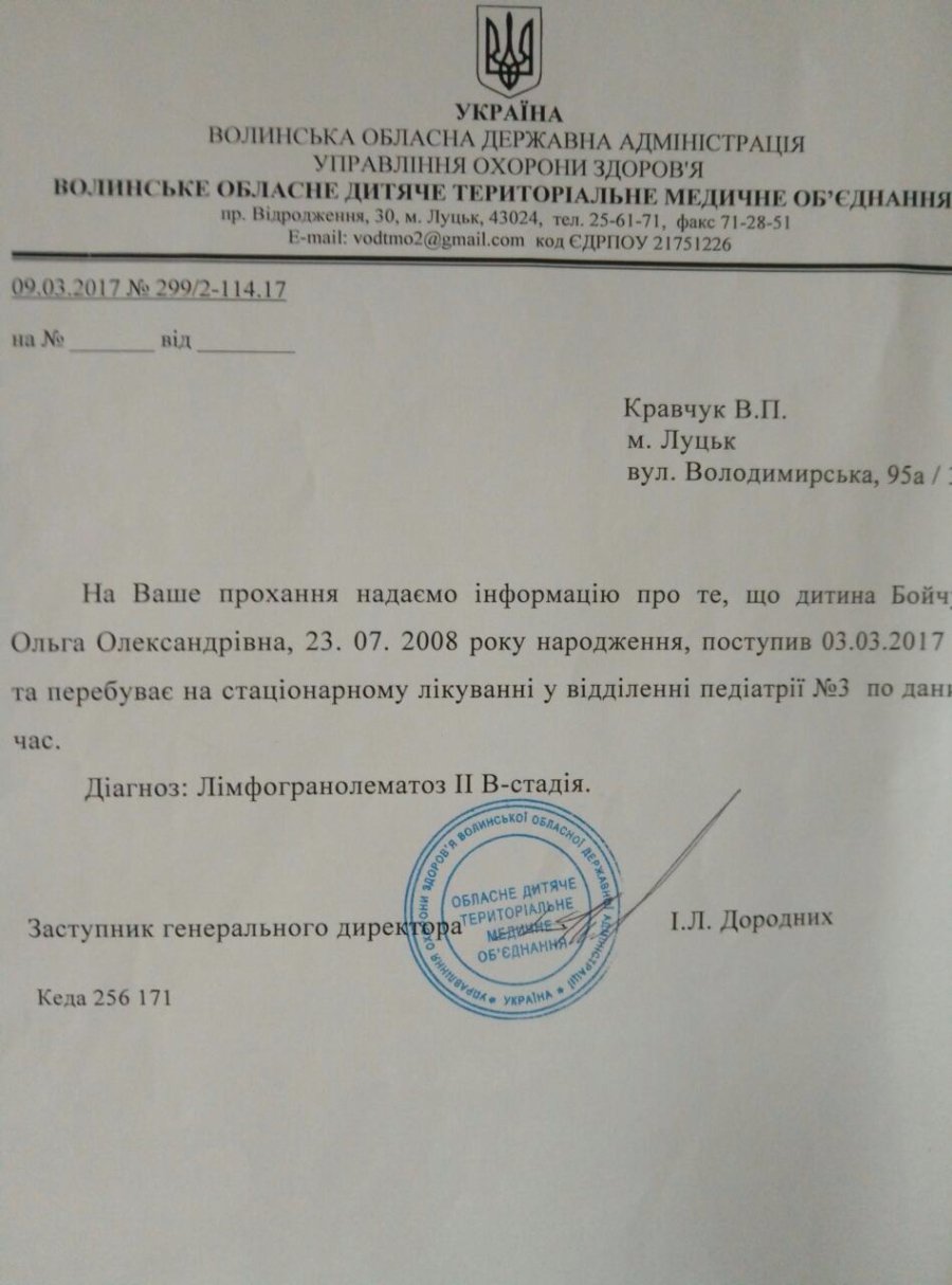 У дівчинки виявили онкозахворювання і їй будуть робити хіміотерапію. Потрібно назбирати близько 10 тисяч доларів, щоб лікуватись в спеціалізованій клініці Білорусі, - повідомляє мама дівчинки.