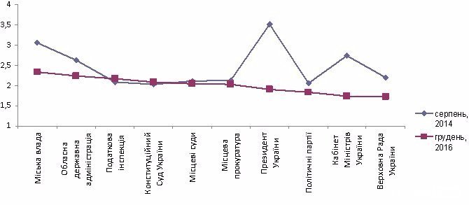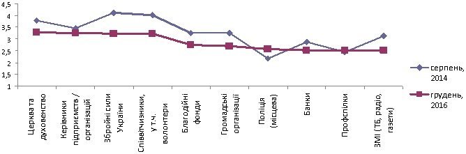 Пропонований лучанам список з 20 інституцій розділився навпіл: до половини мешканці міста висловили нейтральне ставлення (як от ЗМІ (3,14 / 2,51 бали у 2014 та 2016 відповідно), профспілки (2,45 / 2,52), банки (2,88 / 2,52), поліція (2,16 / 2,56) – останні 4 на Рис. 1) і довірливе (перші 6 на Рис. 1); ще десятьом – недовіру (Рис. 2).