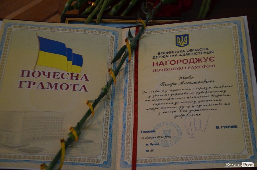 Так, за особисту мужність та героїзм, виявлений у захисті державного суверенітету та територіальної цілісності України, сприянні дальшому зміцненню патріотичного духу у суспільстві та з нагоди Дня добровольця почесною грамотою ОДА нагородили Юрія Гучака, Олександра Добровольського, подякою – Миколу Габдулхакова, Сергія Долинського, Олександра Шульгана. А Ігорю Дименку та Андрію Стасюку вручили цінні подарунки – годинники.