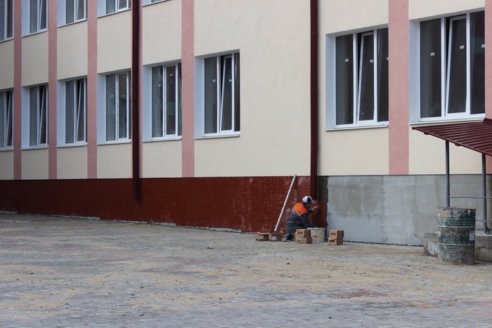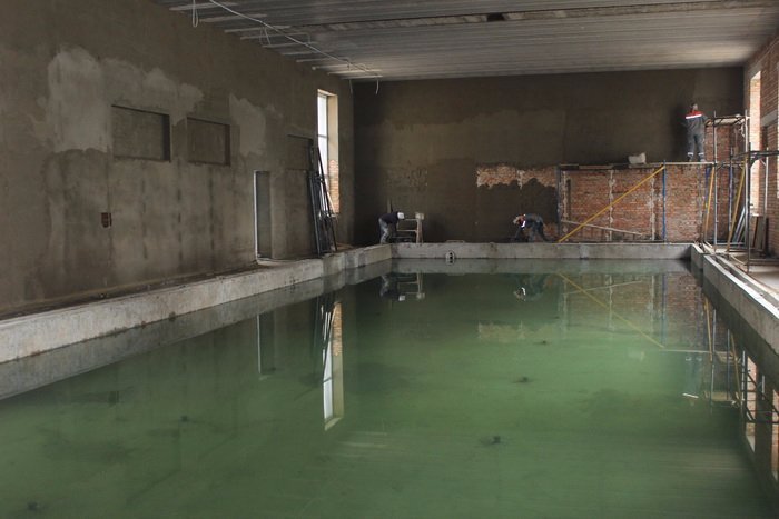 Тривають роботи і у приміщенні басейну. Уже зведена чаша басейну, яку заповнили водою для перевірки. Також на подвір'ї школи частково вкладена бруківка.